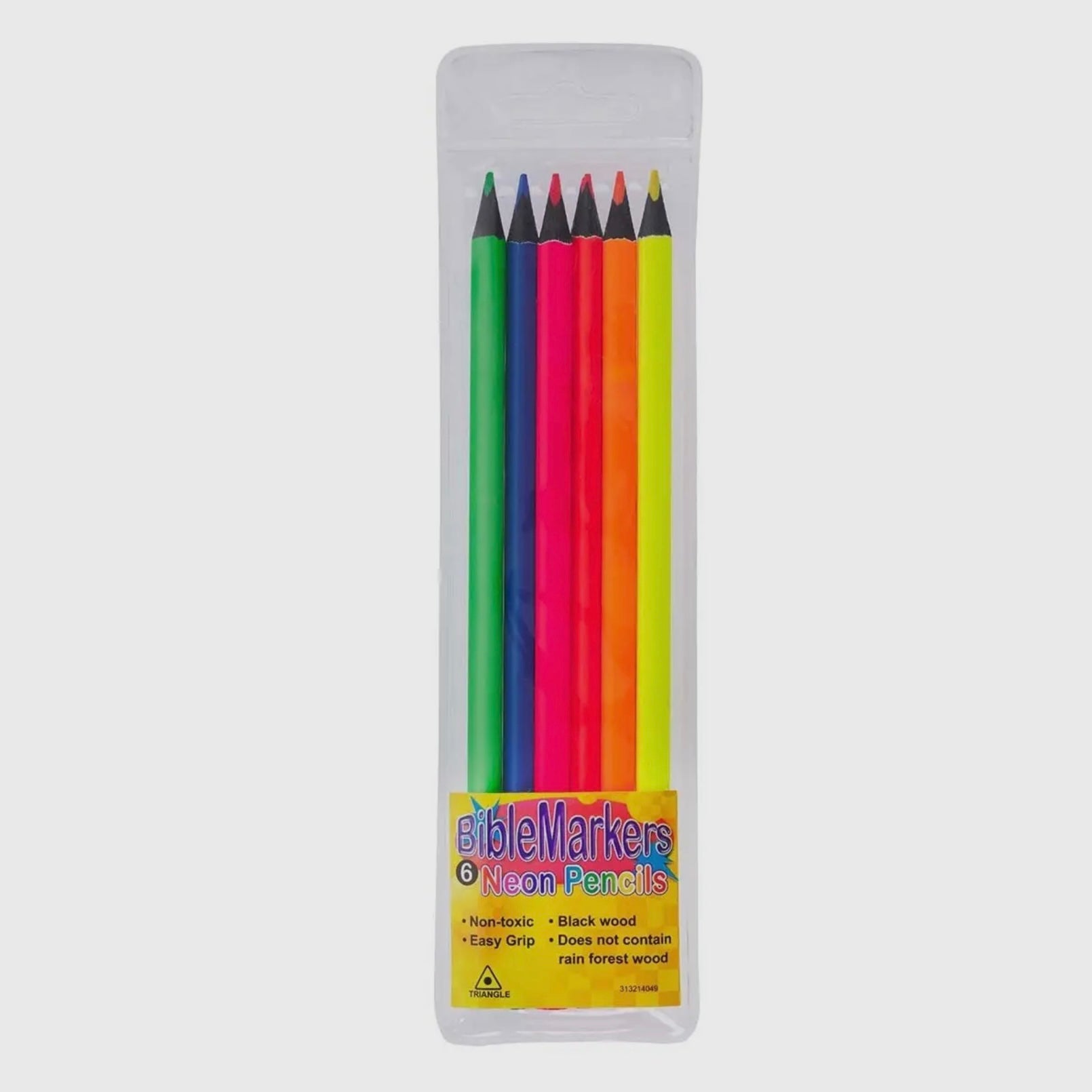 An assorted pack of brightly colored neon pencil BibleMarkers to mark Scripture. These specially designed dry markers are ideal for use on delicate Bible paper. Set of 6 Dry Pencil Highlighters, 6 Colors: Pink, Yellow, Green, Orange, Blue, Red, Won't Bleed Through Paper, Ergonomically Triangular Shape, Responsibly Sourced, No Rain Forest Wood, Non-toxic, Individual Pencil Size: 6.9" x 0.3" x 0.3" (175 x 8 x 8mm), Package Size: 8.25" x 2 x 0.3" (210 x 51 x 8mm)