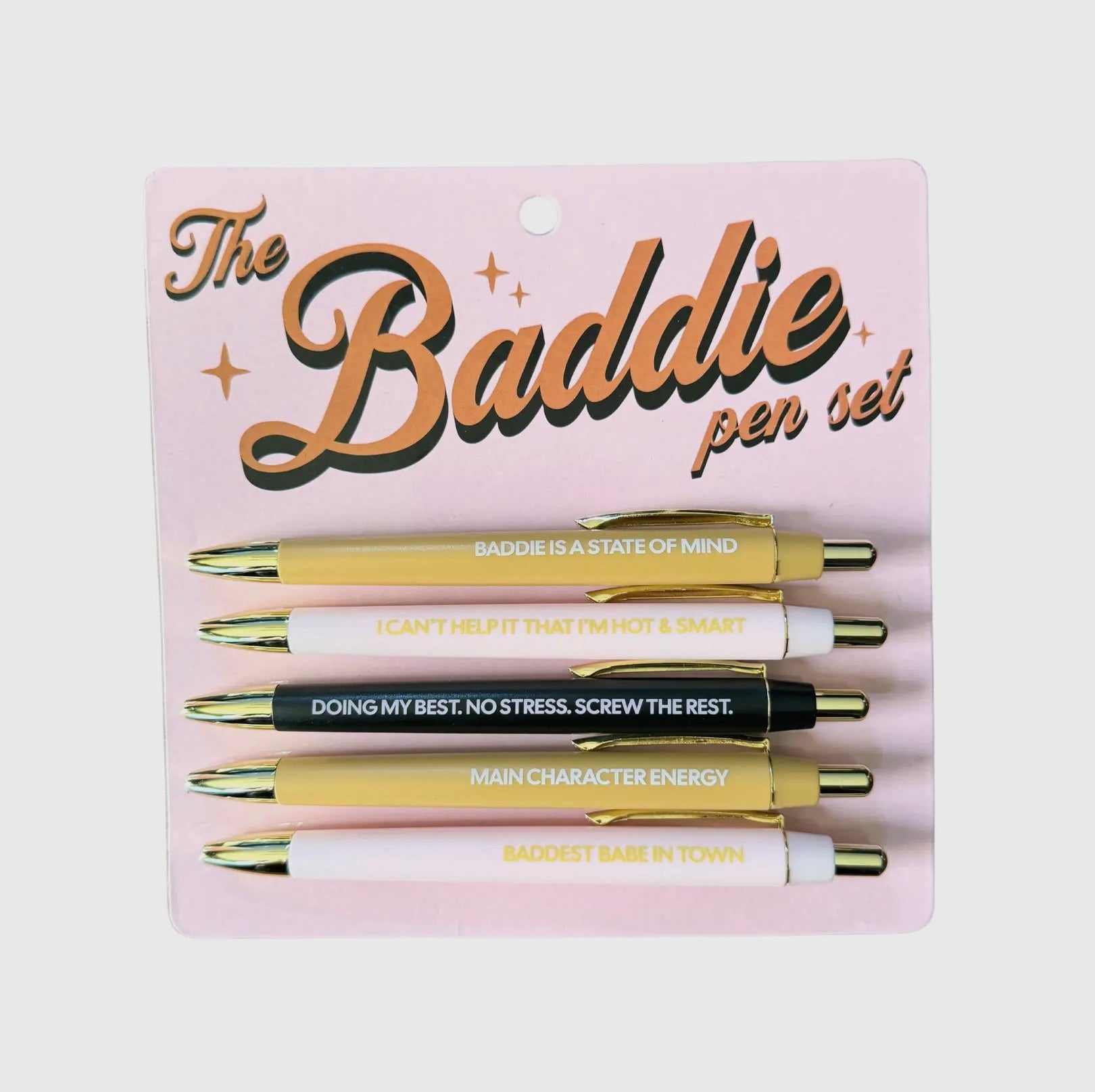 Elevate your writing game with The Baddie Pen Set. This set of five black ink ballpoint pens is perfect for those who appreciate humor and functionality. Perfect as stocking stuffers or holiday gifts, these pens make for an easy and affordable present under $20. Upgrade any writing experience with a touch of wit.